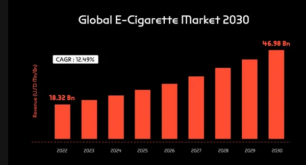 不過數據顯示,從 2023 年到 2030 年,全球電子菸市場複合年增長率 (CAGR) 將達到 12.49%。整個市場的價值從 2022 年的 183.2 億美元預估會增加到 2030 年的 469.8 億美元。