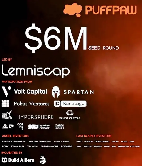 昨日,berachain 上主打「戒菸 to Earn」的項目 Puffpaw 完成600萬美金種子輪融資,Lemniscap 領投,Volt Capital、Spartan、Folius Ventures、Karatage、Seed Club Ventures、Hypersphere、Panga Capital、EVG、Corner、Social Graph Venture 和 Nonce Classic 等參投。