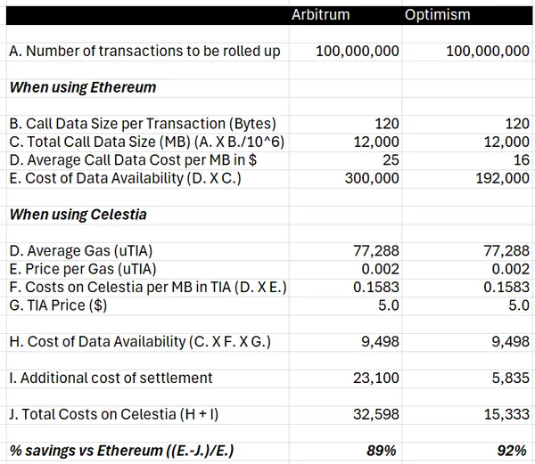 除了數據可用性成本外,還需要額外的結算成本,即 Celestia 在以太坊上發布一個指針,以便追溯到 Celestia 上的相關區塊,從而保證在 Celestia 上發布的數據的排序和完整性。