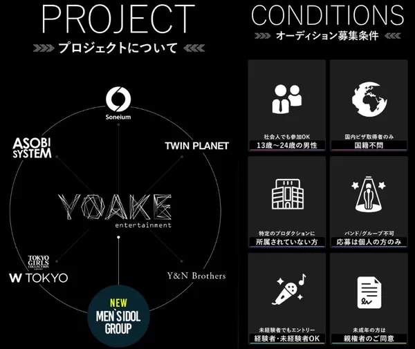 本次選拔計畫由秋元康擔任總製作人,並與多家娛樂業巨頭聯手,包括 W TOKYO(東京女孩秀主辦方)、Asobi 系統、Twin Planet 等公司。他們透過 YOAKE Entertainment,旨在建立一支具有全球市場潛力的男團。而此次最大亮點便是 Web3 區塊鏈技術的引入,透過 Sony 與 Startale Labs 合作開發的 Soneium 區塊鏈,為偶像與粉絲之間構建嶄新的互動生態系。