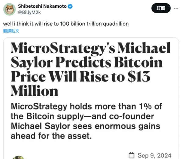 狗狗幣的創始人比利馬庫斯則引用了相關報導,並笑稱他預測比特幣將「升至 100 兆億兆美元(100,000,000,000,000,000,000,000,000,000,000)」。