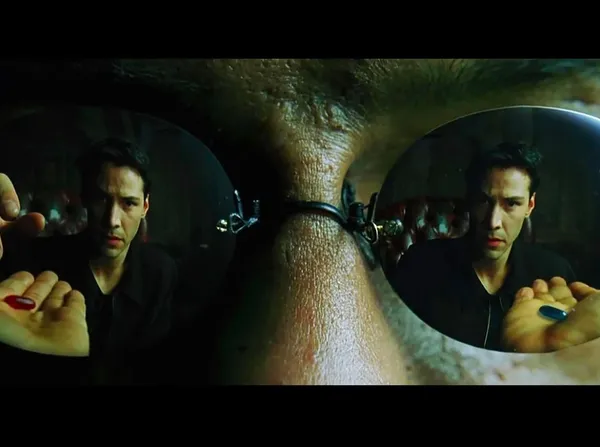 莫菲斯帶尼歐來到一個昏暗的房間,手上拿著兩顆膠囊大小的藥丸,一顆是紅色,另一顆是藍色,紅色藥丸象徵著覺醒與真相,藍色藥丸則代表繼續待在幻象中,過著舒適但虛假的生活。