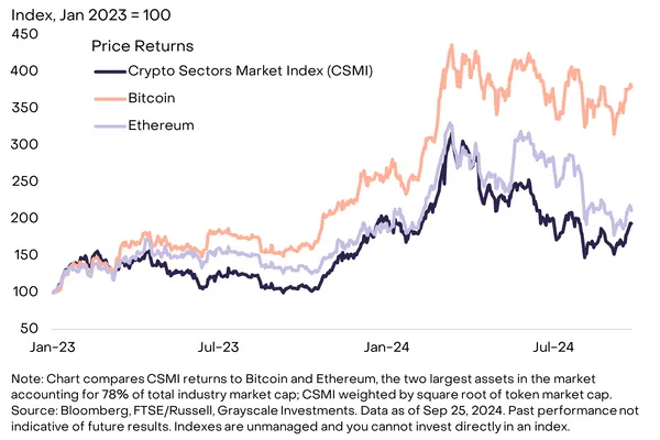 2024 年第三季度,加密市場橫盤,依據 FTSE/Grayscale 加密行業指數系列進行評估。