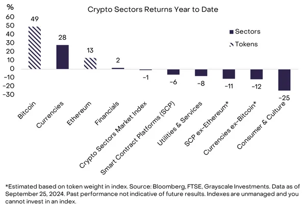 從收益的角度來看,比特幣和貨幣類加密類別在 2024 年表現優於其他市場領域(圖 2),這可能反映了現貨比特幣交易所交易產品(ETPs)在美國市場的成功上市,以及有利的宏觀環境(有關更多細節,可參考我們之前的季度報告《Grayscale 研究洞察:2024 年第三季度的加密行業》)。