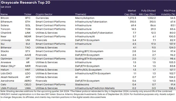 我們已更新 Grayscale 研究的前 20 位。前 20 位代表了一組多樣化的資產,涵蓋了加密行業,這些資產在未來一個季度具有高潛力。本季度新增的資產有 SUI、TAO、OP、HNT、CELO 和 UMA。
