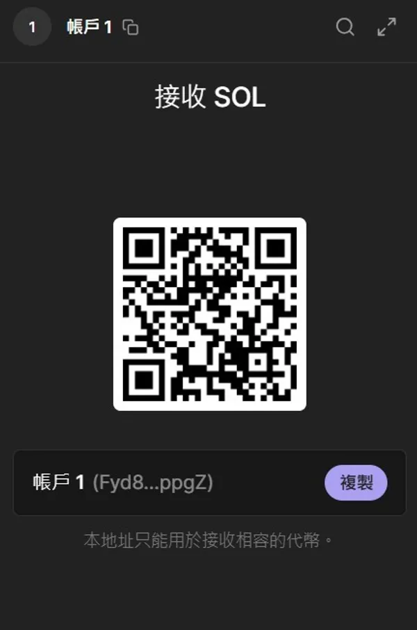 Phantom錢包點接收,就會看到錢包地址和QRCode。