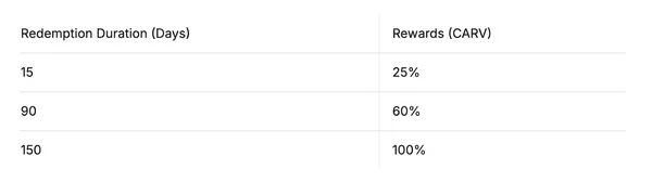 在領取 veCARV 後請記住,將其轉換為 $CARV 需要配置解鎖期 (redeem period)。解鎖期越長,贖回率越高——最高可達100%的全額回報。注意,一旦 veCARV 進入贖回期,它將不再有資格參與治理投票。