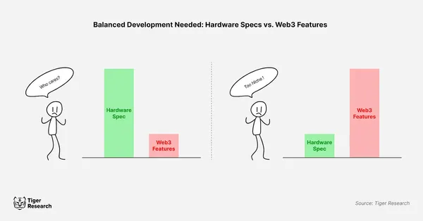 大多數 Web3 智慧型手機在相機性能和螢幕刷新率方面表現不佳,這使得它們不適合大眾市場。此外,售價超過 500 美元的配置顯得過於昂貴,讓普通消費者難以選擇。