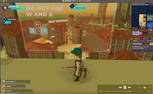 具體流程為,根據指示撿取組裝立體機動裝置的道具,然後在屋頂持續按著滑鼠右鍵啟動立體機動裝置,接著操控 A、D 鍵控制方向(無需使用 W、S),到目的地時放開滑鼠右鍵就能墜落。