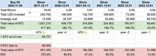 四年前我做了一份表格用於教學,記錄一百鎂可買到多少比特幣,並計算在不同時間點進場的盈虧,結果是除非中途放棄,否則想虧都很難。我剛補上過去一年的數據,並計算投資表現: