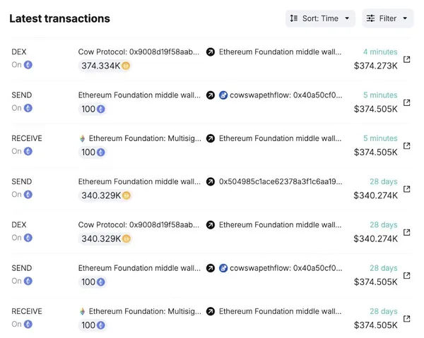 以太坊基金會(Ethereum Foundation)再度拋售以太幣的消息正引發市場關注。根據鏈上追蹤資訊平台 Spot on Chain 提供的最新數據顯示,該基金會於 12 月 10 日拋出 100 枚以太幣,並換成約 374,334 $DAI。若以近期市價換算,2024 年以來基金會已累計賣出 4,366 枚以太幣,總價值達約 1,221 萬美元,平均出手價格約為每枚 2,796 美元。