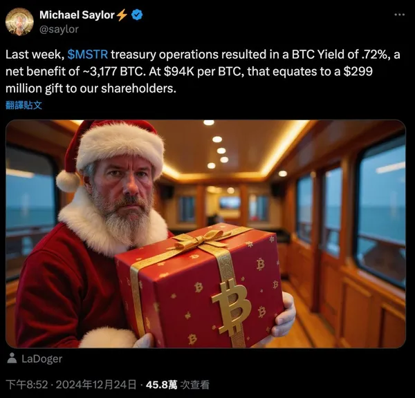MicroStrategy 創辦人暨比特幣戰略負責人 Michael Saylor 也在社交平台上高調宣示其「股東得利論」。他透露,近期公司財務部門以比特幣產生約 0.72% 的收益,折合約 3,177 枚比特幣,以近期比特幣價格約 9.4 萬美元推算,約為 2.99 億美元的利潤。Saylor 更稱之為「給公司股東的一份聖誕禮物」。