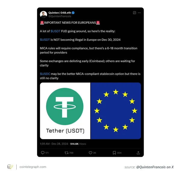 關於 USDT 合規性的不確定性,市場上存在不同看法。一些觀點認為 USDT 可能面臨限制,而另一些則認為它可能在 MiCA 規定的過渡期內繼續運營。