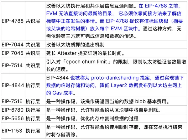 Dencun 升級中還包含了一些如提高以太坊使用效率的 EIP,如 EIP-7516、EIP-6780、EIP-5656、EIP-1153 等。Dencun 升級中具體包含的 EIP 詳見一下表。