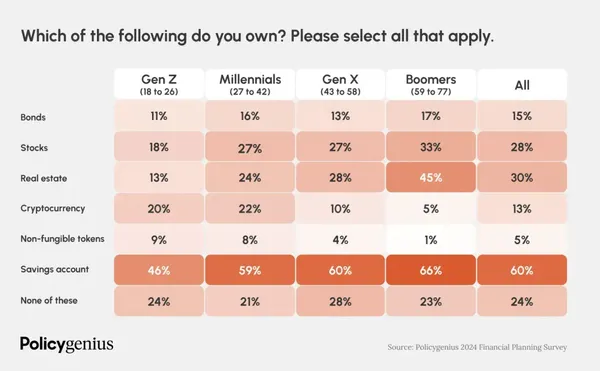 而 Policygenius 的調查則顯示,美國 Z 世代(18-26歲)中有 20% 持有加密貨幣,高於持有股票的比例(18%),與嬰兒潮世代的投資習慣有鮮明的對比。