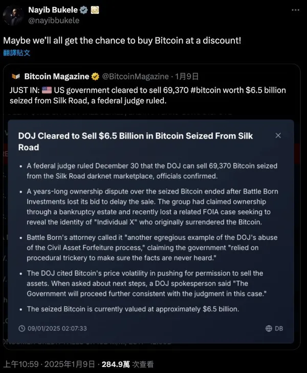 關於美國司法部近期獲得法院裁定,可正式拍賣自暗網 Silk Road 案件所沒收的 69,370 顆比特幣。雖然目前司法部都還未正式公告,不過,仍有許多投資人憂心這批龐大數量的比特幣投入市場,短期內將形成賣壓,造成價格下跌。然而,薩爾瓦多總統布格磊(Nayib Bukele)卻從中看到了「撿便宜」的可能性,他在 X 上表示:「也許我們都能有機會以折扣價格買進比特幣」。
