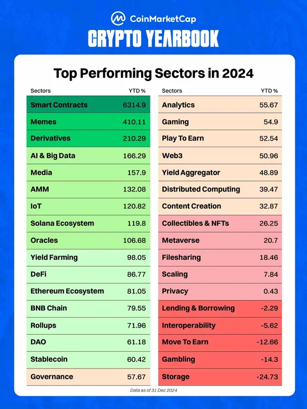 智慧合約相關項目以 6000% 的回報率位居榜首,而表現最差的是儲存賽道,年回報率為 -24%。