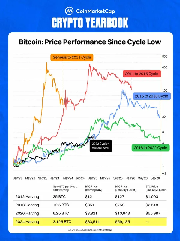 比特幣和大盤基本 3-4 年一個週期。從下圖可以清晰的比較看出,黑線即 24 年的新週期中,比特幣價格並未有明顯的掉頭向下趨勢。