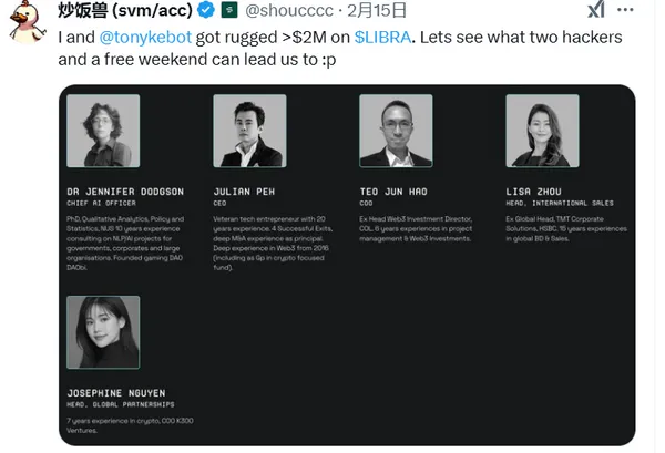 Fuzzland聯合創始人Chaofan Shou便開始炮轟KIP Protocol,直呼「RNM,退錢!」他哭訴自己與Solayer工程師@tonykebot在LIBRA項目中虧損超過200萬美元,並爆出LIBRA背後團隊KIP Protocol的核心成員名單,聲稱「讓我們看看兩個駭客和一個空閒週末能給我們帶來什麼」,暗示將採取行動。(據悉,Shou在網路安全領域享有盛譽,其團隊曾成功挽回超過3300萬美元的被盜資金,在Web2安全領域的漏洞賞金超過190萬美元。)