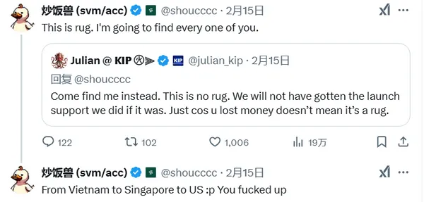 接下來幾天Shou與 KIP Protocol聯合創始人Julian在推特上進行在線「撕逼」,Julian說「要是項目真的rug了的話那就來找我吧,你虧錢是你的問題,並不意味著項目方rug了」。