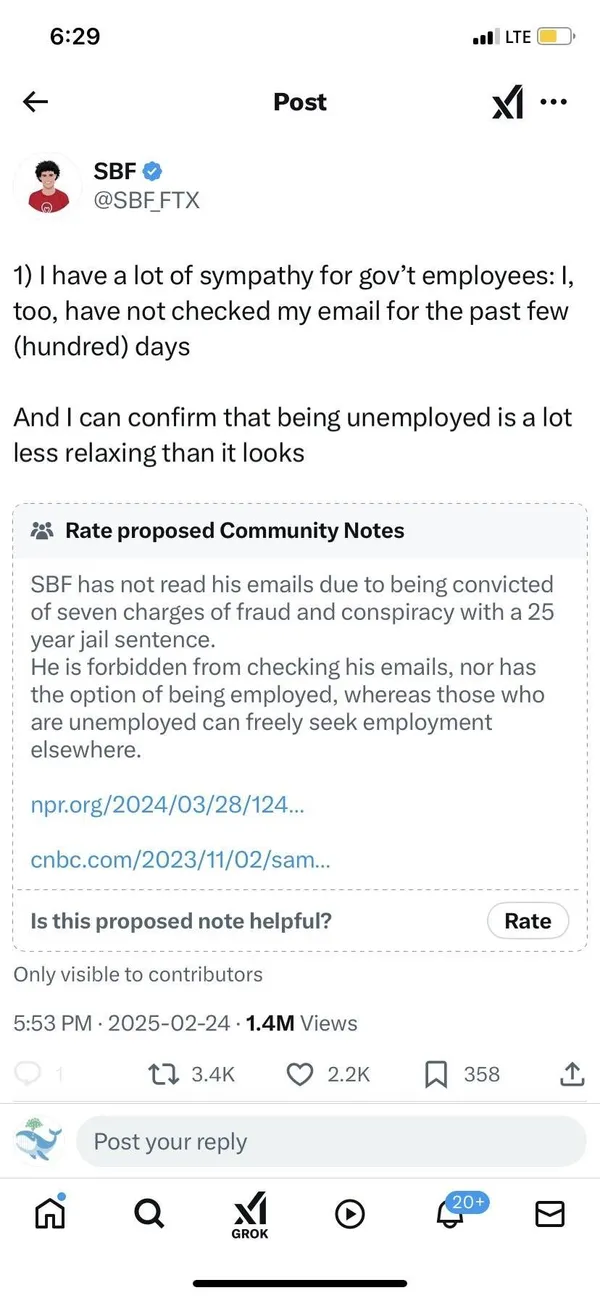 目前,SBF 該推文被添加了社區備註,「SBF 由於被判犯有七項欺詐和共謀罪,並被判處 25 年監禁,因此沒有閱讀他的電子郵件。他被禁止查看他的電子郵件,也沒有選擇就業的選擇,而失業的人可以自由地在其他地方尋找工作」