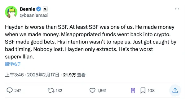 Hayden 比 SBF 更糟糕。至少 SBF 是我們中的一員。我們賺錢時他也賺錢。挪用的資金又回到了加密貨幣領域。SBF 下了好賭注。他的意圖不是強姦我們。只是時機不對。沒有人輸。Hayden 只會提取。他是最糟糕的超級惡棍。