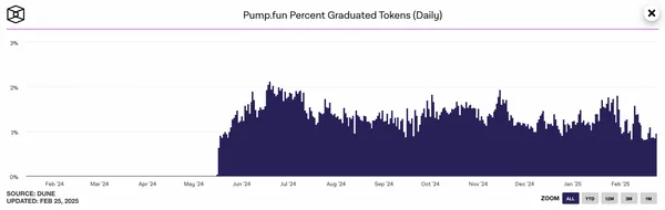 The Block數據顯示,截至2月24日,Pump.fun代幣轉至Raydium的畢業率僅為0.96%,較歷史峰值的2.12%下跌了54.7%。