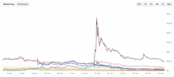 一方面,Solana上的MEME降溫後市值遭遇腰斬。CoinGecko數據顯示,截至2月26日,Solana上的MEME市值為86.4億美元,而在1月最高接近150億美元。