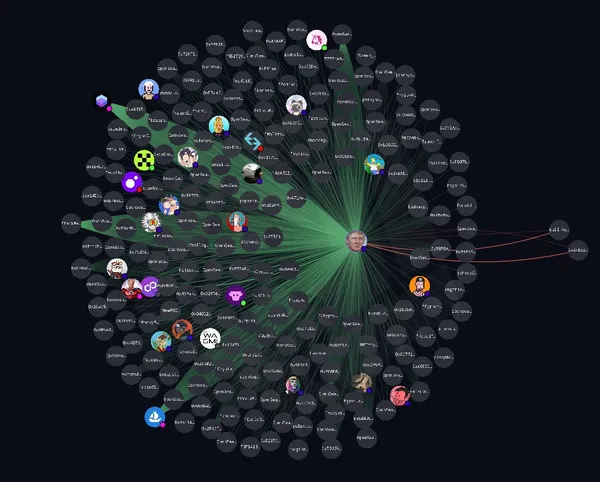 畫面中顯示的金流圖,有點像是一個人手中拿著一大把的氣球。正中間就是輸入的錢包帳號,而圖中的每個圓形,都代表一個錢包地址;綠線代表資金流入;紅線則代表資金流出。