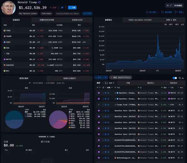 - 左上角的內容和錢包帳戶的投資組合相關,包括個人的持幣組合、不同鏈上的資產分布,以及過去的投資組合變化。