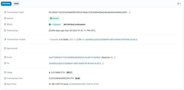 可以看到交易的詳細資訊,包括發送者、接收者、交易金額、Gas費用、時間戳記等。除了加密貨幣的交易資料之外,也可以看到整個錢包狀態,或是NFT的交易紀錄。