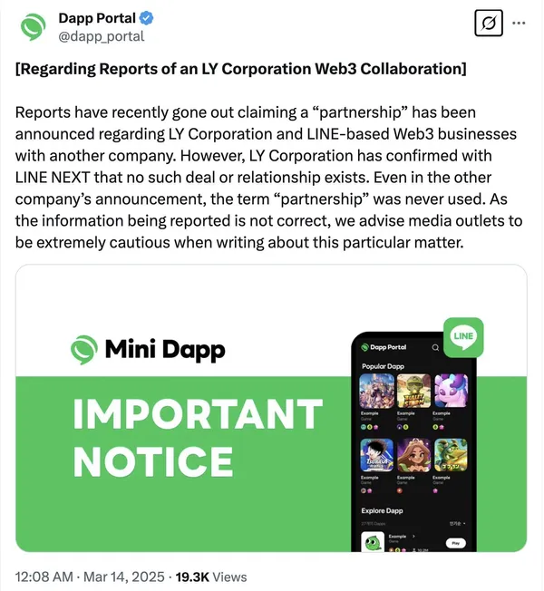 Dapp Portal還提到,即使在另一家公司的公告中,也從未使用過「合作伙伴關係」一詞。事實也確實如此,Soneium於X平台發布的官方聲明為:「LINE 小程序(MINI-App)即將登陸 Soneium」,其聲稱要將 LINE 小程序引入鏈上,與 2 億活躍用戶 LINE 建立聯繫,而相關開發者也將受益於 Soneium 的支持。