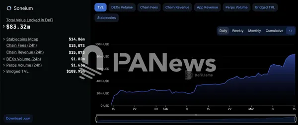 據DefiLlama數據,截至3月15日,Layer 2擴展解決方案Soneium的TVL已達8000萬美元,為8308萬美元。其TVL在2月份增長率高達90%,過去一週增長率也有近24%。此外,作為生態繁榮的重要指標,Soneium生態的去中心化交易所也增長迅猛,其中Sonex、Kyo Finance和Velodrome的TVL在過去一個月分別取得了1504%、429%和125%的顯著增長。