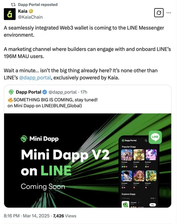 事實上,LINE與Kaia似乎已經在釋放這種信號——3月14日,Dapp Portal發布重大更新,宣布即將上線Mini Dapp的V2版本,Kaia引用這條推文並表示:「大事不是已經發生了嗎?它就是 LINE 的Dapp Portal,由 Kaia 獨家提供支持。」隨後,Dapp Portal又轉發了Kaia的評論。