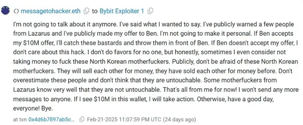 有趣的是,在追蹤過程中,他們發現許多與駭客地址無關的交易。在眾多筆和錢包相關的轉帳之中,有許多一般用戶也轉了一點錢進去相關的受害錢包,就是為了留言「湊熱鬧」。甚至有人聲稱是白帽駭客,只要提供豐厚獎金就願意提供協助。