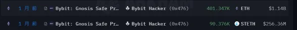 之後就可以看到,從Bybit交易所一共有401,346顆以太幣(ETH)、90,375顆stETH轉入駭客錢包。