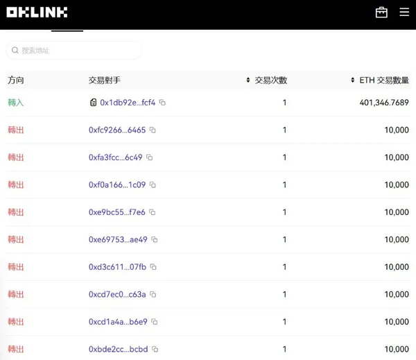 如果使用OKLink,同樣也可以看到這個以太坊的錢包首次交易時間是2025年02月21日,錢包收到最大筆的交易是401,346顆以太幣,且有多筆10,000顆以太幣( ETH)的轉移紀錄。
