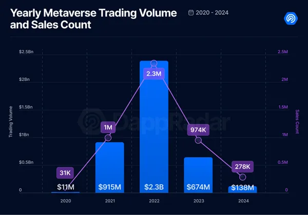 根據DappRadar數據,2024年元宇宙NFT項目的交易額與銷售數量均跌至2020年以來最低水準,交易量同比驟降80%,銷售量較上年同期暴跌71%。