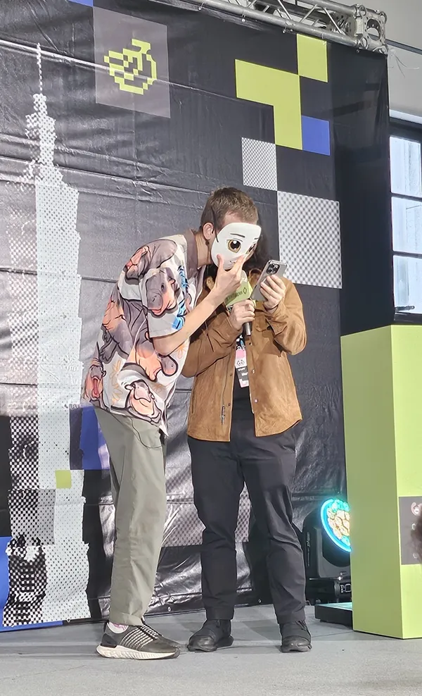 而今年,V神再次以出人意料的裝扮登場。他身穿一件印有他認養的泰國動物園迷你河馬「Moo Deng」圖案襯衫,頭戴爆火NFT「Milady」的少女漫畫眼面具,引起台下觀眾一陣陣驚呼聲。
