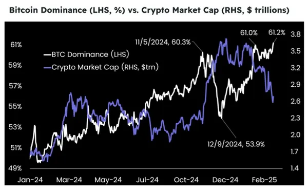 然而,市場結構仍對比特幣有利。儘管加密貨幣總市值大幅下跌,但比特幣的主導地位已攀升至61%以上,這表明在宏觀不確定性加劇的環境下,資金正從風險更高的山寨幣輪動至比特幣。
