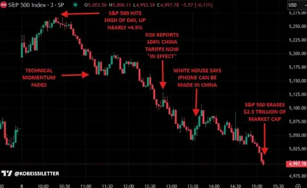 抄底失敗,市場並沒有等來好消息。今日凌晨,白宮新聞秘書表示對中國的 104% 的額外關稅已於東部時間中午生效,全球金融市場再次跳水。