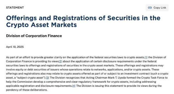 雖然還是尚未明確哪些加密貨幣屬於證券,但它基於 SEC 對現有公司披露資訊的觀察,試圖為行業提供一個更明確的參考框架。