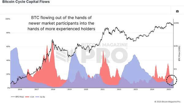 最具洞察力的鏈上指標之一是“比特幣週期資本流動圖”,該圖表根據幣齡對已實現資本進行細分,隔離了新入場者(持幣時間<1個月)、中期持有者(1-2年)等不同群體,以觀察資本遷移路徑。紅色波段(新入場者)在106000美元歷史高點附近急劇上升,表明當時市場頂部出現了大量受FOMO情緒驅動的恐慌性買盤。此後,該群體的活躍度已顯著降溫,回落至與牛市初期至中期相符的水準。