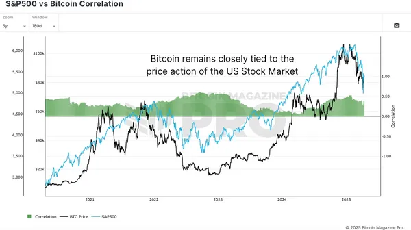 儘管鏈上數據令人鼓舞,但宏觀不利因素仍然存在。對標普500指數與比特幣相關性圖表的分析表明,比特幣仍與美國股票市場保持高度關聯。隨著對潛在全球衰退的擔憂加劇,傳統市場的持續疲軟可能會影響比特幣在短期內反彈的能力。