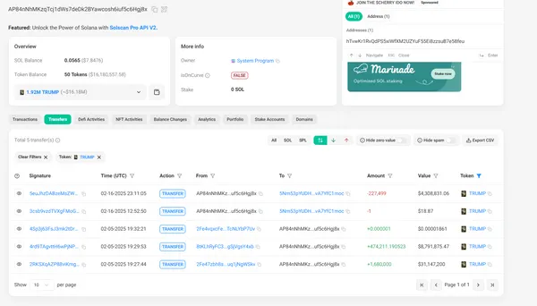 1月20日的數據顯示,該位址共持有超過100萬枚代幣,目前已全部清零。 從操作路徑來看,這個位址疑似是TRUMP代幣專案方的小號位址。