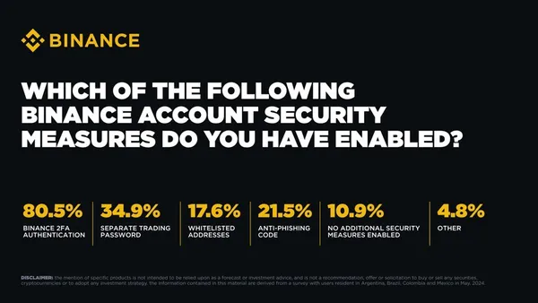根據幣安一項大規模用戶調查顯示,超過80%的受訪者已啟用雙重驗證(2FA),84%的受訪者表示信任如幣安投資者保護基金(SAFU)等保護機制,展現用戶資安意識顯著提升,且對由交易所主導的保護系統信心逐漸增強。