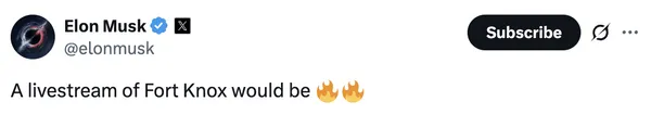 時至今日,關於Fort Knox黃金是否仍完好無損的猜測仍然存在。前些時候,甚至傳出馬斯克將直播審計過程的消息,但這場「即將到來」的審計很快便無疾而終。
