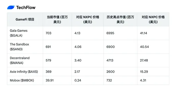 以 NXPC 當前 16.37% 的流通量(約 1.637 億枚)為基準,參考 Gala Games、The Sandbox、Decentraland、Axie Infinity、Mobox 等頭部項目的當前市值和歷史高點,可以做一個理論上的推算: