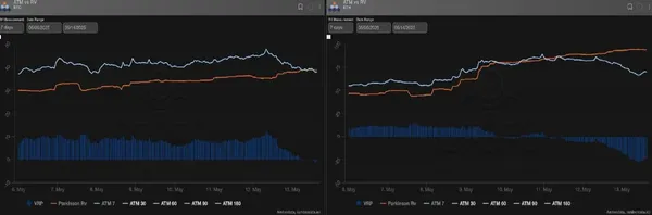 比特幣的實際波動率回升了約8個百分點,並重新突破10萬美元大關。以太坊則更為搶眼,其實際波動率飆升至90%,短短兩日內價格跳漲30%。比特幣短期隱含波動率小幅走低,而以太坊因價格劇烈波動導致隱含波動率飆升了20個波動率點。