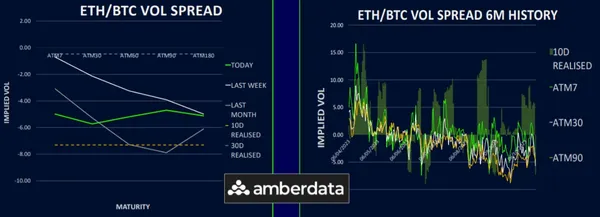 ETH/BTC在過去一週飆升33%,目前正測試0.025關鍵下行趨勢阻力位。隨著以太坊在已實現波動率上表現極為突出,其短期波動率溢價已飆升至35個波動率點。